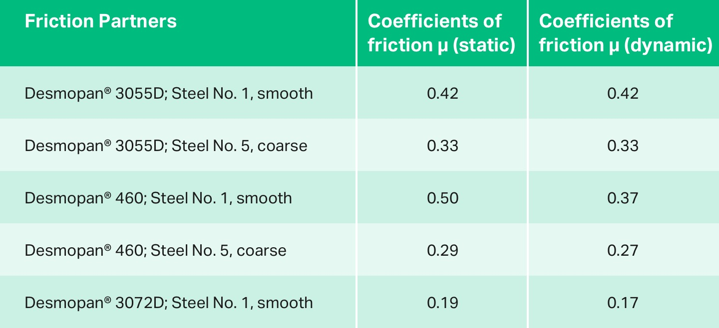 플라스틱의 경우, 마찰 거동을 의미 있게 평가하는 것은 실질적으로 불가능합니다. 왜냐하면 실제 마찰 과정에는 포괄적으로 정의될 수 없는 다양한 효과들이 동반되기 때문입니다. Desmopan® 제품의 마찰 거동은 주로 그 경도(hardness)와 표면 마감 상태(surface finish)에 의해 결정됩니다. 일반적으로 재료의 경도가 낮을수록 마찰력이 증가합니다. 이로 인해 유연한 제품에서는 "스틱-슬립(stick-slip)" 현상이 발생할 수 있습니다. 마찰 거동은 또한 시험 대상이 되는 상대 표면(material pair)과 그 표면의 상태(예: 젖은 상태, 마른 상태)에도 영향을 받습니다. 아래 표는 DIN-EN-ISO-8295 요구사항에 따라 가죽 무늬(leather-grained)가 있는 Desmopan® 시편과 연마된 강철과의 마찰 거동을 보여주는 참고용 수치입니다 (자세한 내용은 아래 참조)