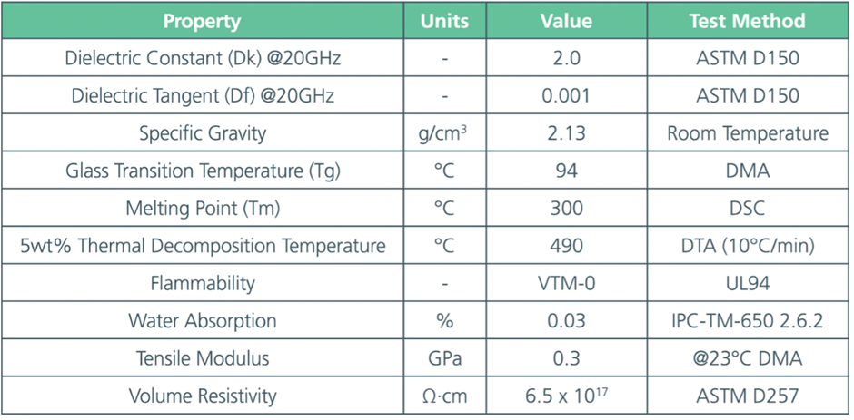 - 액정 고분자(LCP), 폴리이미드, 에폭시와 비교하여 가장 낮은 유전율(2.0)과 낮은 손실 계수(0.001)를 갖춘 뛰어난 전기적 성능. 이러한 특성은 Fluon+ PFA EA-2000 수지를 전기 절연재로서 우수한 소재로 만들어 전자 장치의 신뢰성을 향상